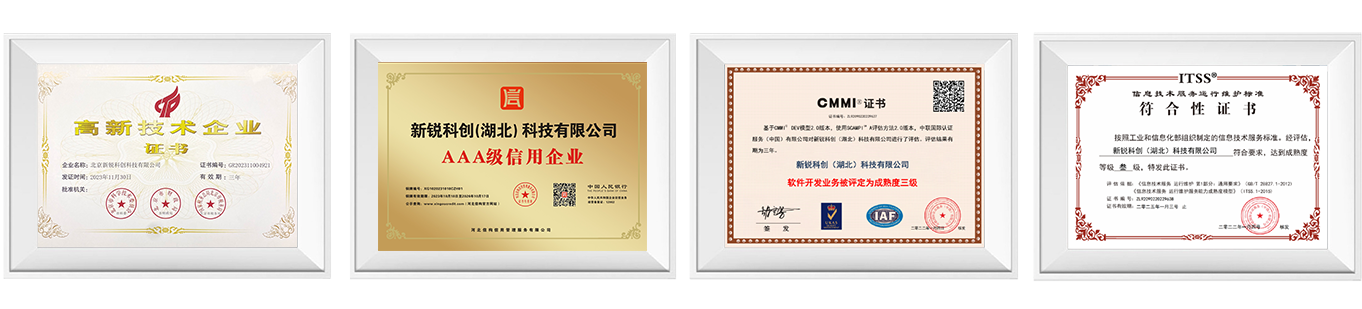 新銳科創獲得了20+項企業認證,包括:高新技術企業、CMMI3級、ITSS、信標委員會實時定位系統標準制定工作組成員、AAA信用等。