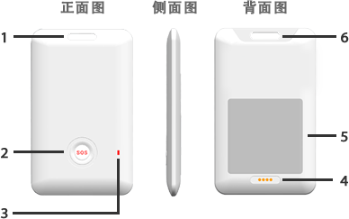 1. 掛孔 2.報(bào)警按鍵 3.指示燈 4.磁吸充電口 5.銘牌 6.掛孔