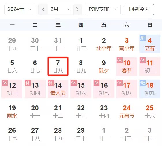 2024年2月7日(臘月二十八)至2024年2月17日(正月初八),共計11天。