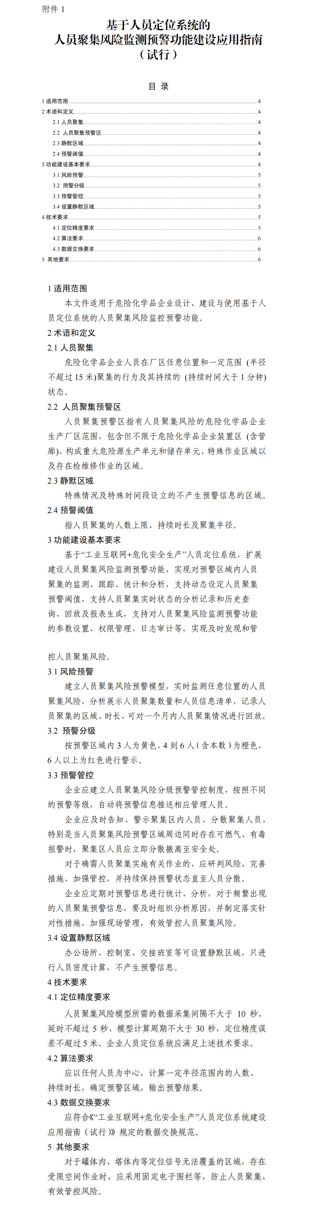 威脅危化安全生產的因素有很多,無論是哪種因素,歸根到底都與“人”相關。為了遏制人員聚集風險,應急管理部和各省應急管理廳于今年10月相繼印發了《基于人員定位系統的人員聚集風險監測預警功能建設應用指南(試行)》,引導相關企業做好人員聚集風險監測與預警管理工作。