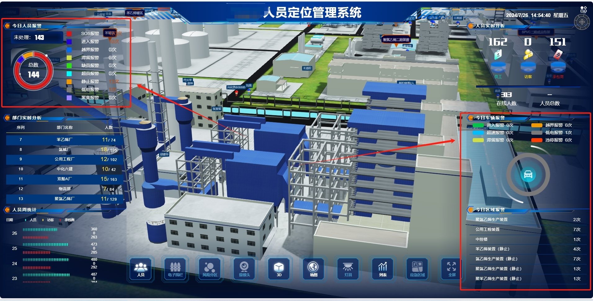 新銳科創的人車定位系統并非單一的定位工具,而是集多種實用功能于一體的綜合性管理平臺,為煉油廠的綜合運營管理提供全方位支持。通過與管理平臺深度融合,該系統能夠實時呈現煉油廠內所有人員與車輛的位置分布及行動軌跡。管理人員在監控中心,通過電子地圖便可清晰掌握每位員工、每臺車輛的實時位置,隨時了解工作進展,實現對生產作業的精細化管理。