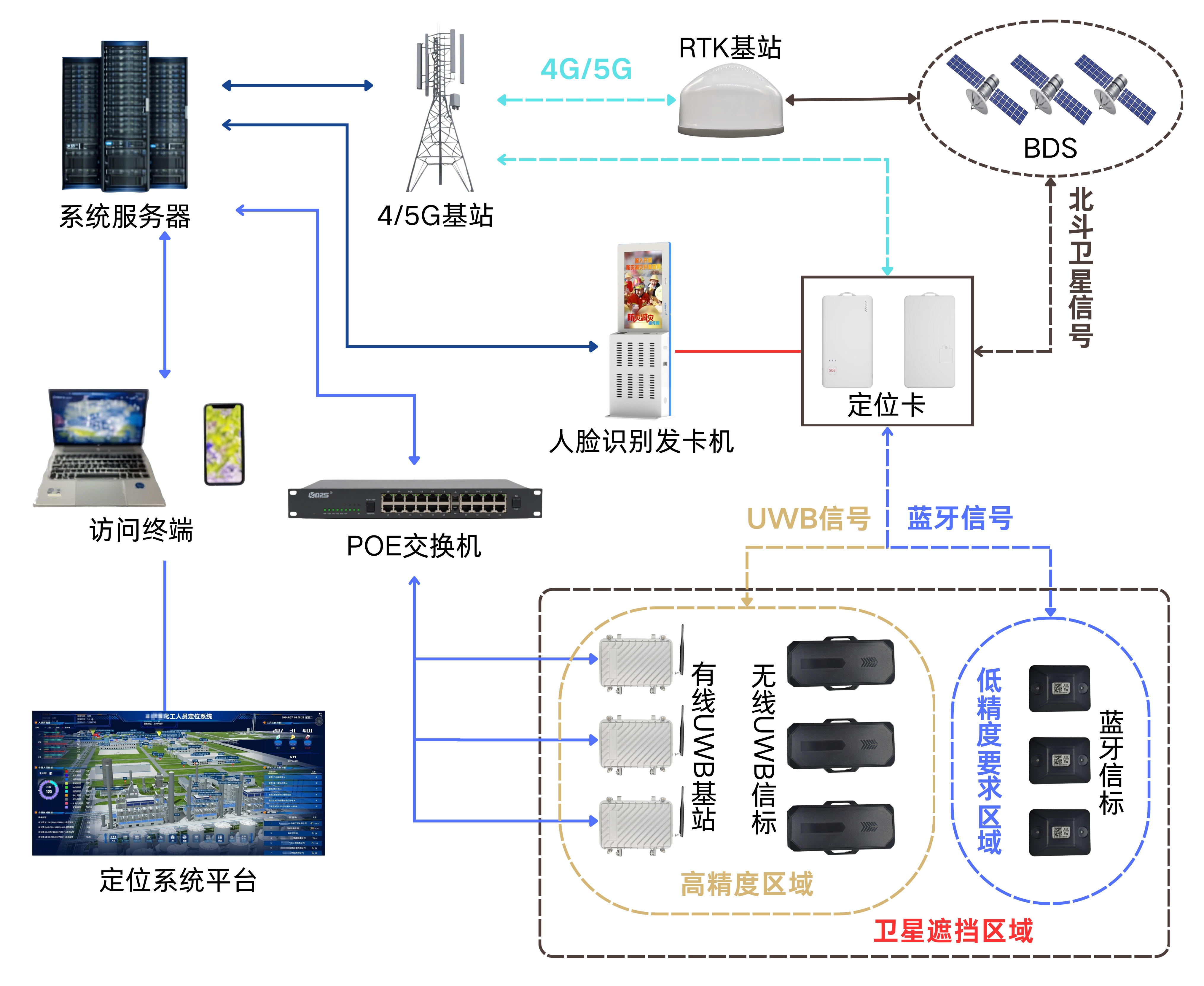 當人員或車輛進入室內或衛星信號遮擋嚴重的區域,藍牙信標和UWB基站開始發揮作用。藍牙信標周期性地發送藍牙廣播信號,定位終端掃描并采集這些信號,獲取信號強度等信息。UWB基站與定位終端進行雙向測距,利用超寬帶信號的精確時間測量特性,計算出兩者之間的距離。通過融合藍牙和UWB的定位數據,系統能夠準確解算出定位終端在室內的位置,實現室內高精度定位。