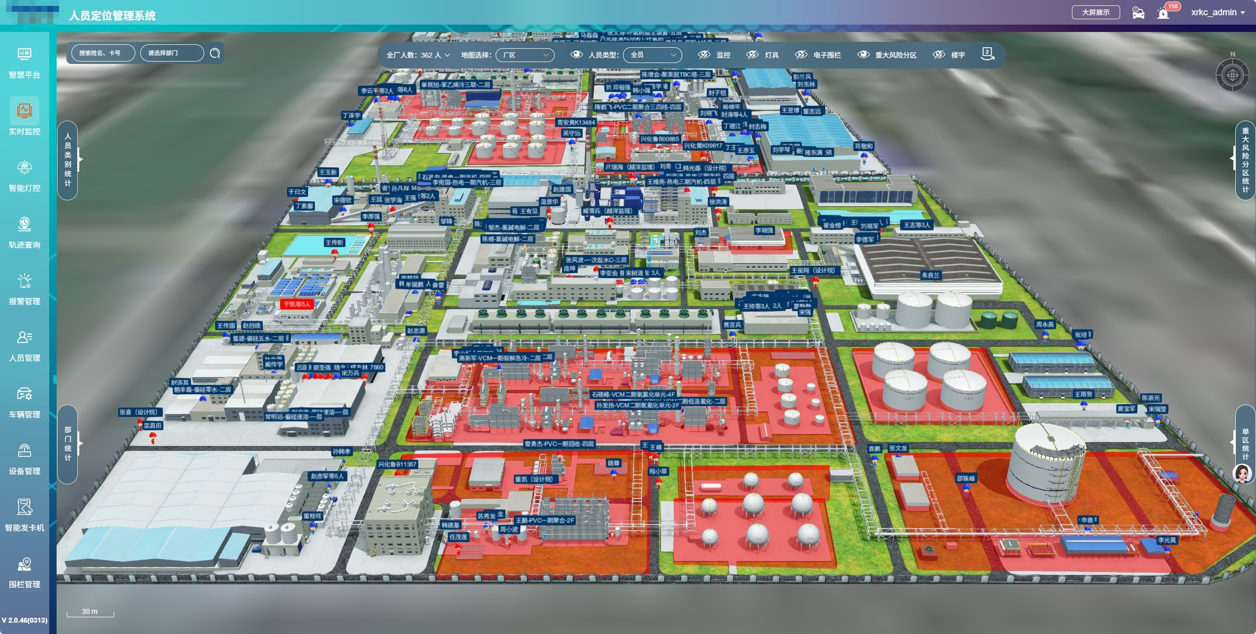 系統(tǒng)能在2D/3D電子地圖上實(shí)時(shí)顯示人員和車輛的位置分布,支持分樓層、分車間查看,還可對(duì)每個(gè)人和車輛進(jìn)行實(shí)時(shí)位置追蹤。