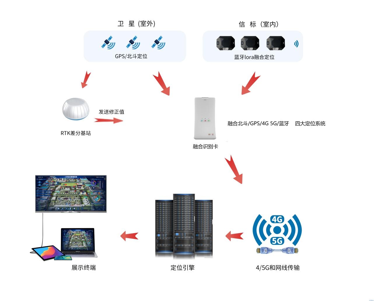室外采用GPS/北斗RTK定位系統(tǒng),該系統(tǒng)由定位終端、RTK差分定位基站、定位引擎、展示終端組成。在衛(wèi)星定位的基礎(chǔ)上,安裝一個(gè)已知坐標(biāo)位置的RTK差分定位基站,差分定位基站根據(jù)已知坐標(biāo)和自己觀測到的衛(wèi)星定位數(shù)據(jù)求出修正值,并將修正值發(fā)送給定位終端(比如人員定位卡),定位終端利用差分基站發(fā)送的修正值,對自己觀測到的衛(wèi)星定位數(shù)據(jù)進(jìn)行修正,從而實(shí)現(xiàn)精準(zhǔn)定位。