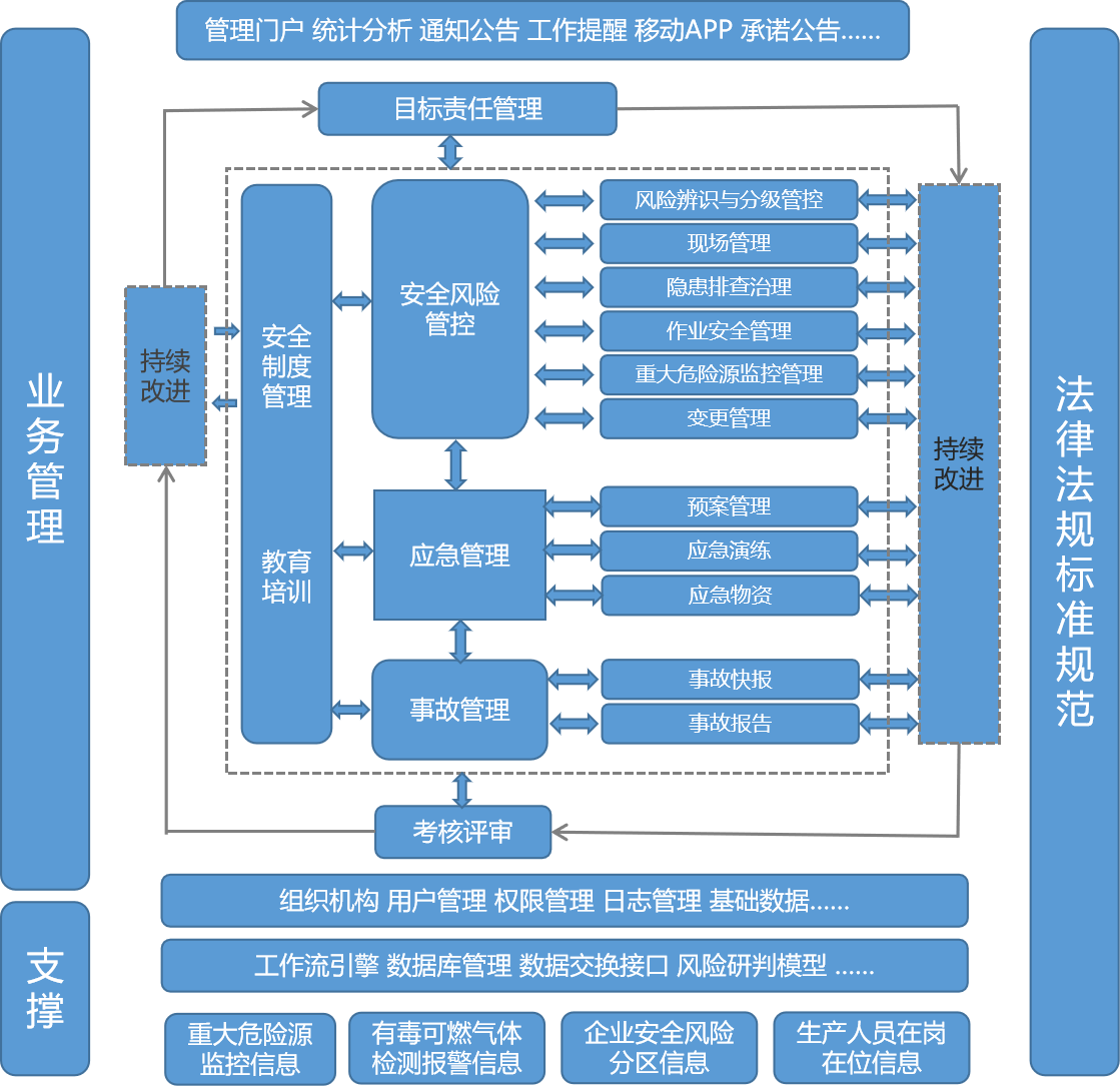主要包括法律法規識別、法規標準庫、安全管理制度管理、安全操作規程管理、安全文件制定與傳閱等功能。