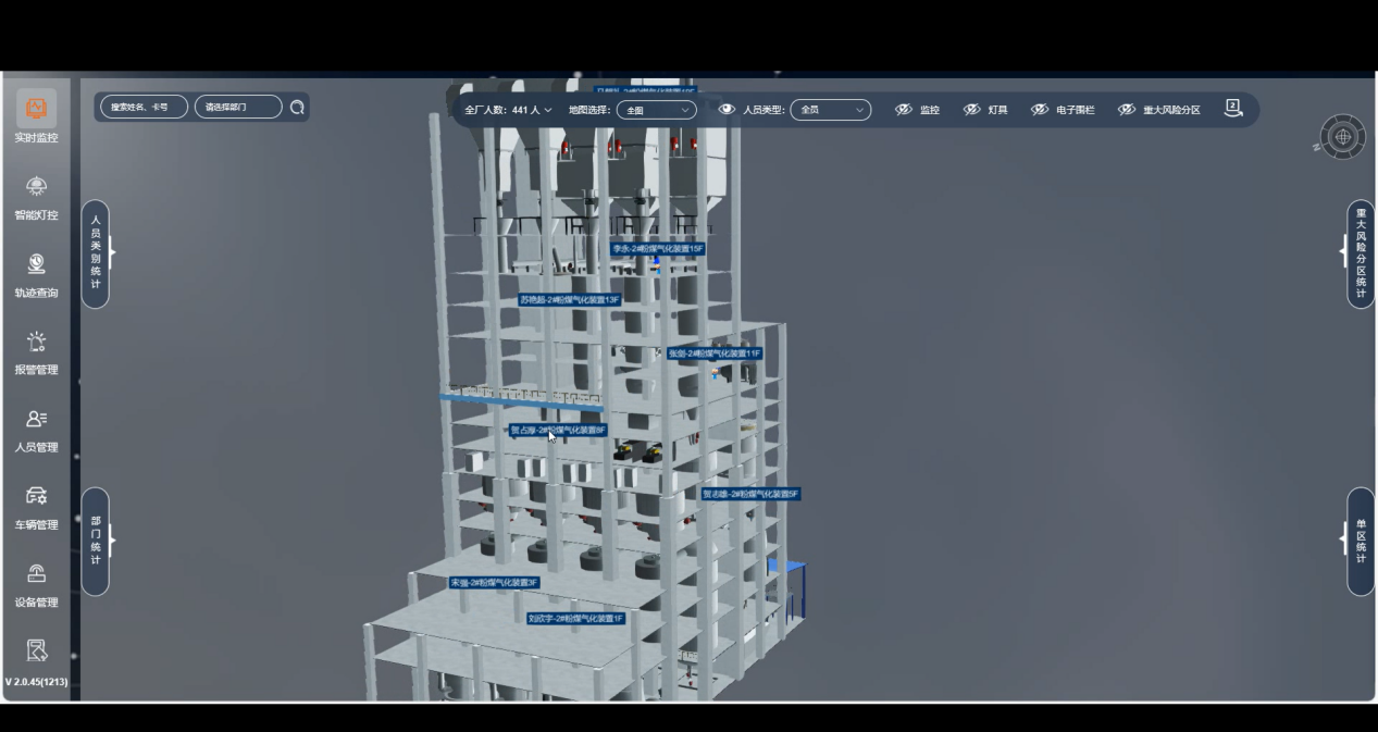 系統支持在2D/3D電子地圖上實時顯示人員位置分布,可分樓層、分車間顯示;可對每個人的實時位置進行跟蹤,實現了對人員位置的實時追蹤和展示。