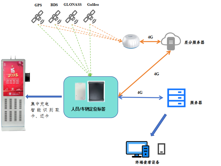 北斗高精度定位卡/車載定位儀:接收北斗衛星導航系統經緯度數據,通過4G與差分服務器相連,獲取差分數據信息,在卡片結算出位置信息,通過4G網絡將位置信息回傳到服務器;